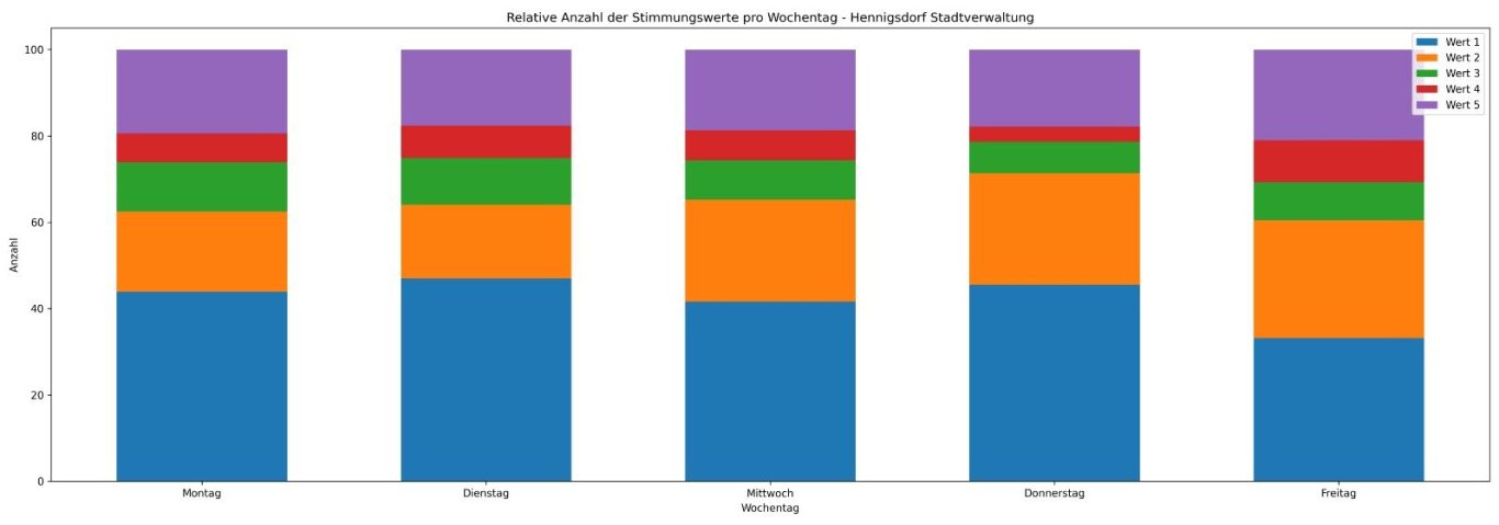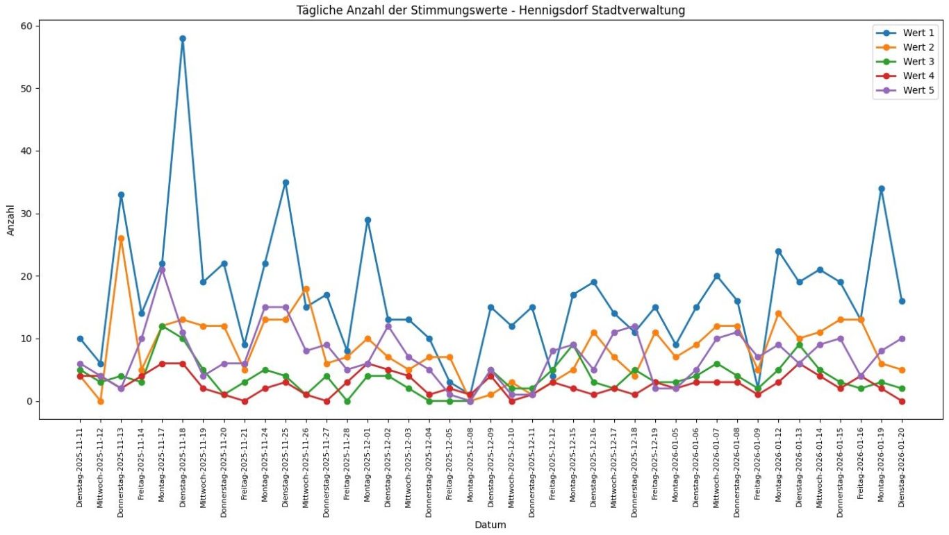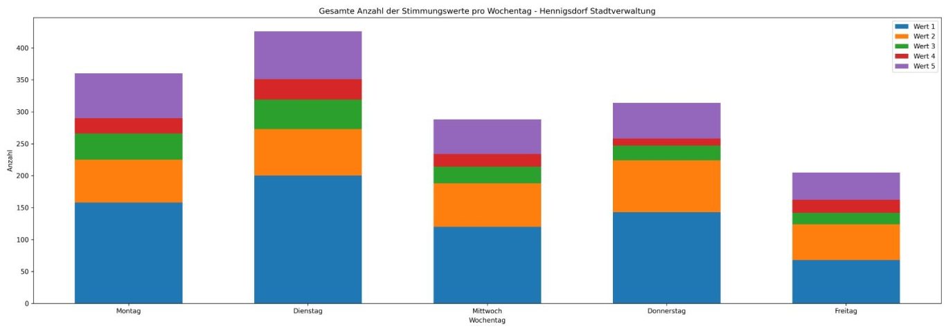 Der zeitliche Verlauf macht sichtbar, dass es zwar tagesabhängige Schwankungen gibt, jedoch keine länger anhaltenden negativen Phasen. Insgesamt bleibt das Stimmungsniveau über den gesamten Zeitraum stabil und überwiegend positiv, was auf eine konstante und grundsätzlich gute Arbeits- und Stimmungslage in der Stadtverwaltung hinweist.