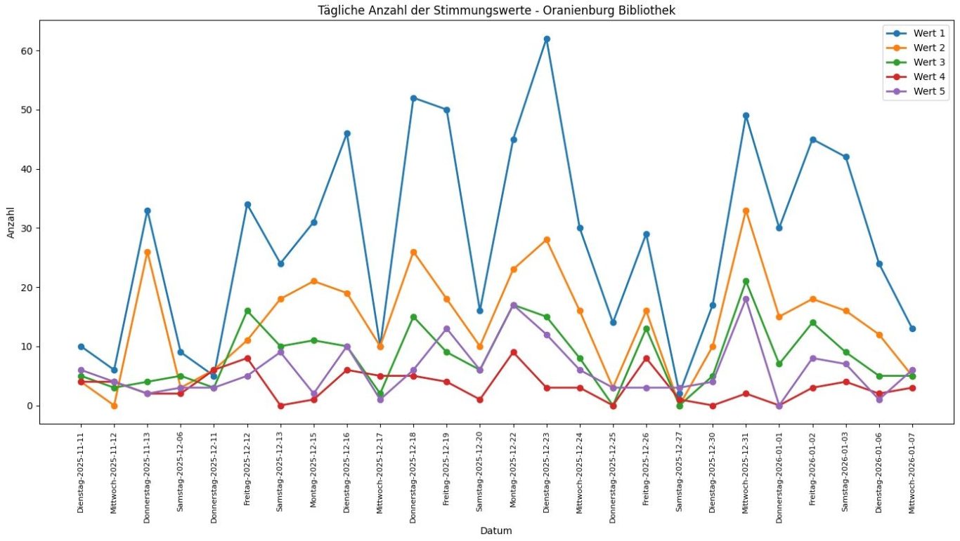 Die Grafiken zeigen die Verteilung und Entwicklung der erfassten Stimmungen in der Bibliothek in Oranienburg von „sehr gut“ (1,0) bis „sehr schlecht“ (5,0) im Zeitraum vom 11. November 2025 bis zum