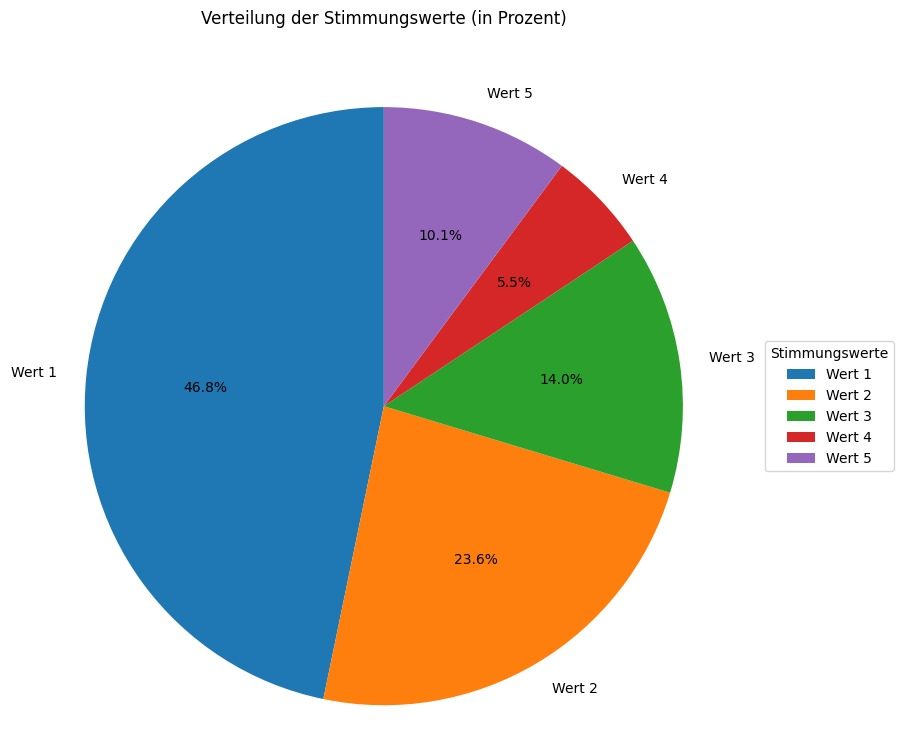 Die prozentuale Gesamtverteilung fasst dieses Bild nochmals zusammen: Rund 70 % der Rückmeldungen entfallen auf die beiden besten Stimmungswerte, während die eindeutig negativen Bewertungen zusammen nur einen kleinen Teil ausmachen.