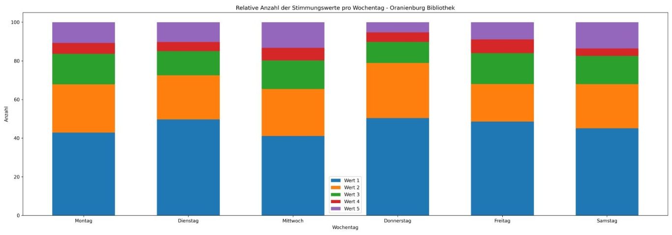 Zusammenfassend zeigen die Diagramme, dass die Bibliothek in Oranienburg im untersuchten Zeitraum ein durchgehend positives emotionales Stimmungsbild aufweist. Die Ergebnisse sprechen für eine hohe Aufenthaltsqualität und eine stabile, überwiegend gute Nutzererfahrung.