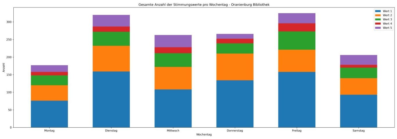 Ein Blick auf die Wochentagsauswertung zeigt, dass die meisten Stimmungsabgaben an Dienstagen und Freitagen erfolgen.