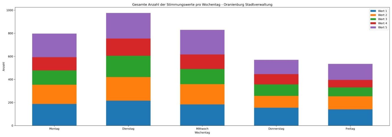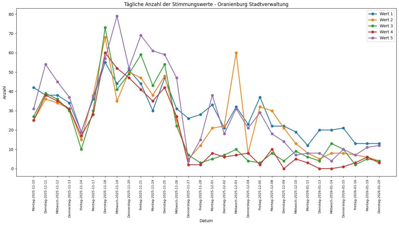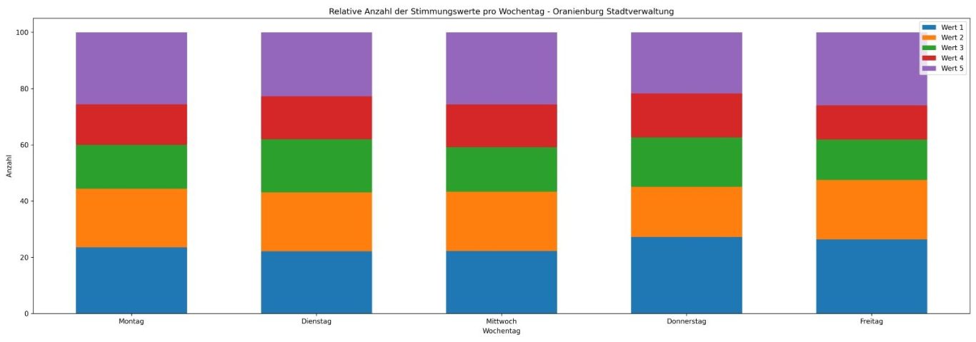 Zusammenfassend verdeutlichen die Diagramme, dass die erfassten Stimmungen in der Stadtverwaltung Oranienburg im betrachteten Zeitraum stark variieren und sich sowohl zeitlich als auch in ihrer Ausprägung unterscheiden.
