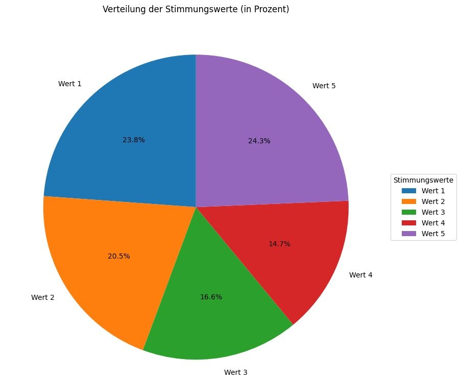 Die prozentuale Gesamtverteilung zeigt, dass alle fünf Stimmungswerte regelmäßig vergeben wurden. Positive, neutrale