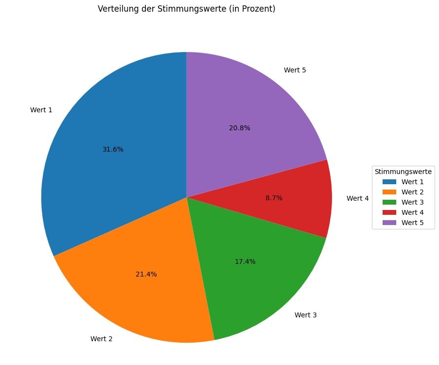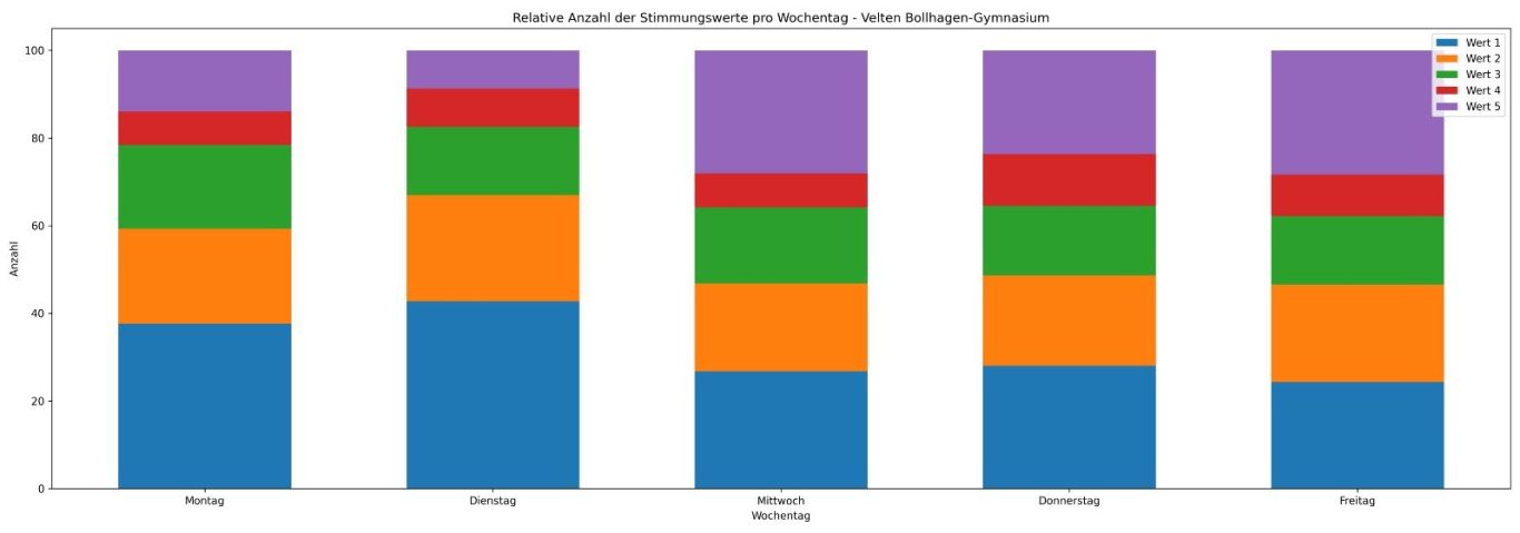 Die Betrachtung der relativen Verteilung pro Wochentag verdeutlicht, dass an allen Tagen Wert 1 den größten Anteil ausmacht. Gleichzeitig verschiebt sich die Zusammensetzung im Verlauf der Woche leicht: Während zu Wochenbeginn die positiven Werte stärker dominieren, ist ab der Wochenmitte eine breitere Streuung über mehrere Bewertungsstufen erkennbar. Insbesondere an Mittwoch und Freitag ist der Anteil von Wert 5 im Verhältnis zu anderen Tagen deutlicher sichtbar, während Wert 4 insgesamt über die Woche hinweg eher gering bleibt.