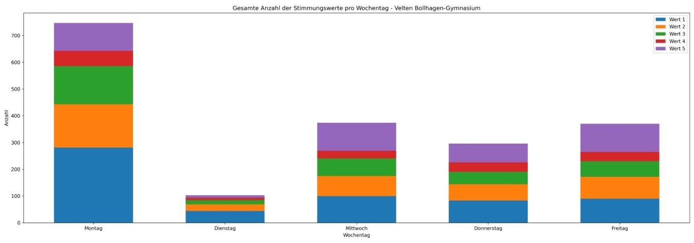 Insgesamt ergibt sich für das Bollhagen-Gymnasium ein mehrheitlich positives, zugleich differenziertes Stimmungsbild. Neben der starken Präsenz der besten Bewertungen sind auch sehr negative Rückmeldungen in relevanter Größenordnung vorhanden, wobei sich die Verteilung im Wochenverlauf leicht verändert und tagesbezogene Schwankungen sichtbar werden.